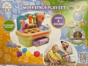 An educational and imaginative workbench playset featuring light and sound effects, various tools, and built from recycled Eco Wood 2.0 material.